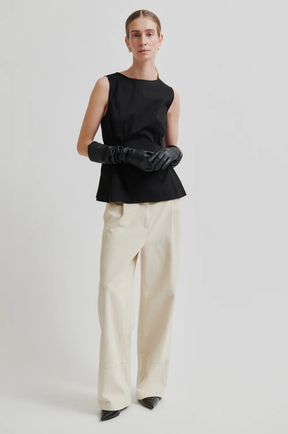 Second Female sleeveless top. The top is made in a soft and smooth cotton blend. Featuring a concelaed zip fastening at the back. Fitted seams at the waist that create a slight peplum effect. Slim fit.