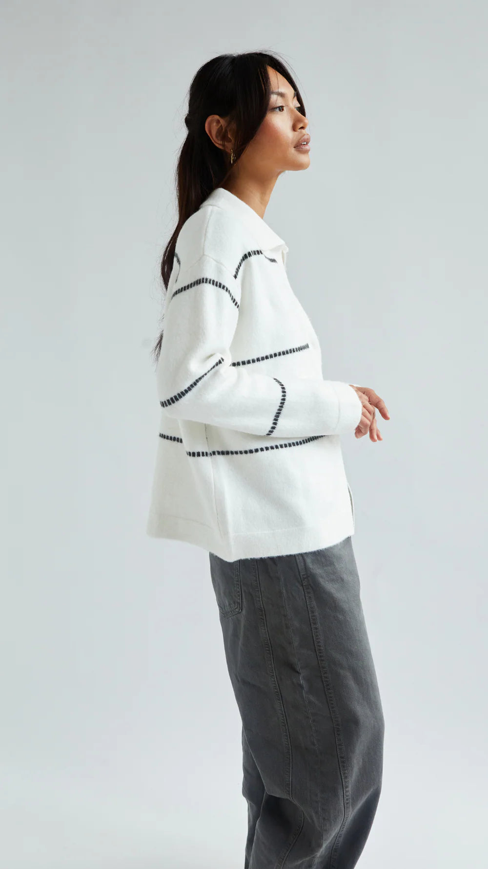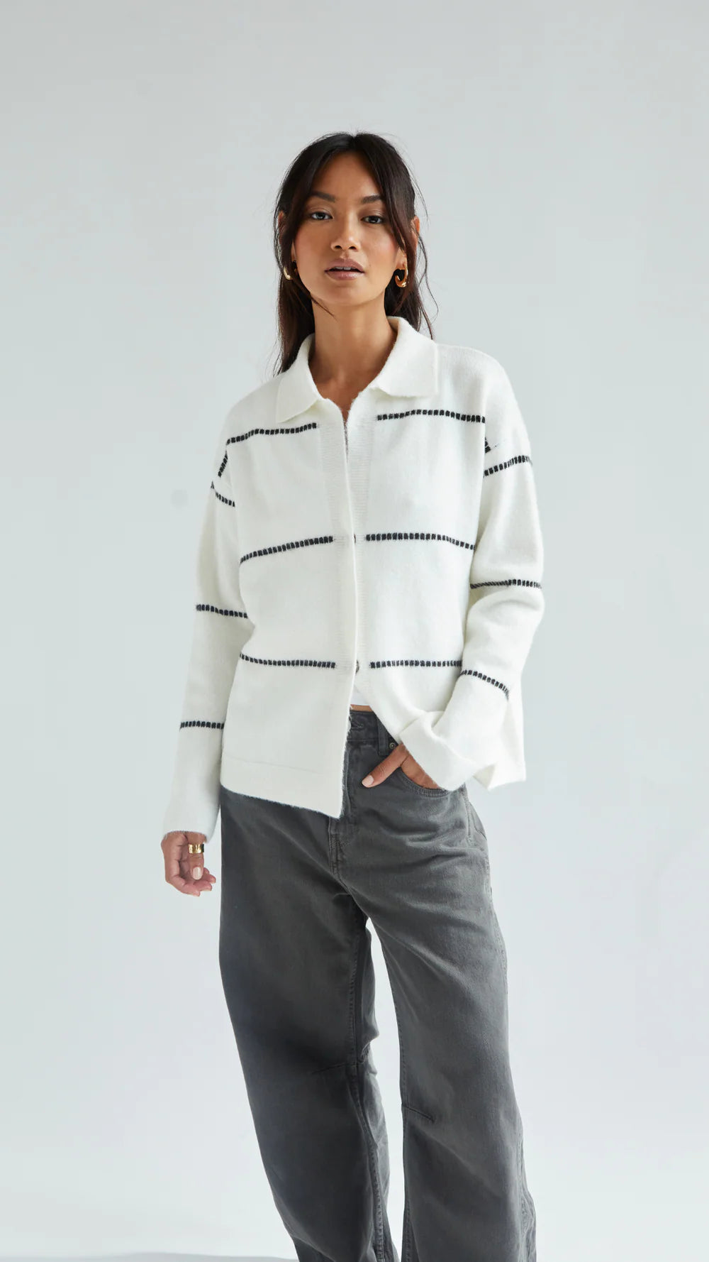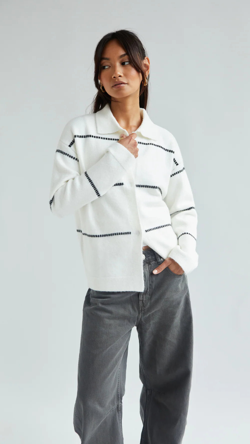 Clara is our new centre front cardigan with polo collar. Relaxed fit and contrast stripe detail give this modern essential a fashion forward edge. Wear open with a vest or tee as an easy cover up for a polished off duty outfit. Invisible metallic snap closures for a clean look