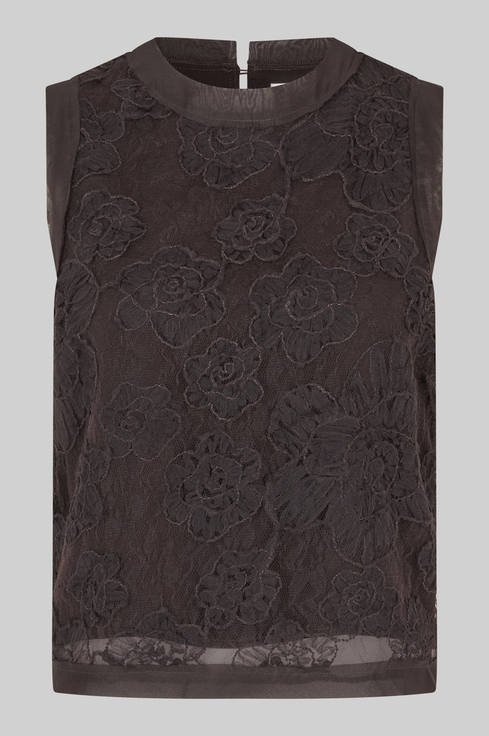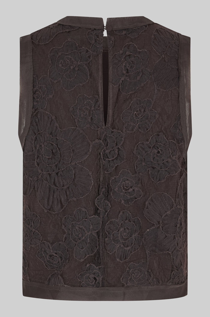 Second Female lace top with flowers. The top comprises a layer of lace and structured flowers over a plain layer. Featuring a keyhole opening at the back with button fastening and short sleeves. Contrast fabric and raw hem details. Regular fit.