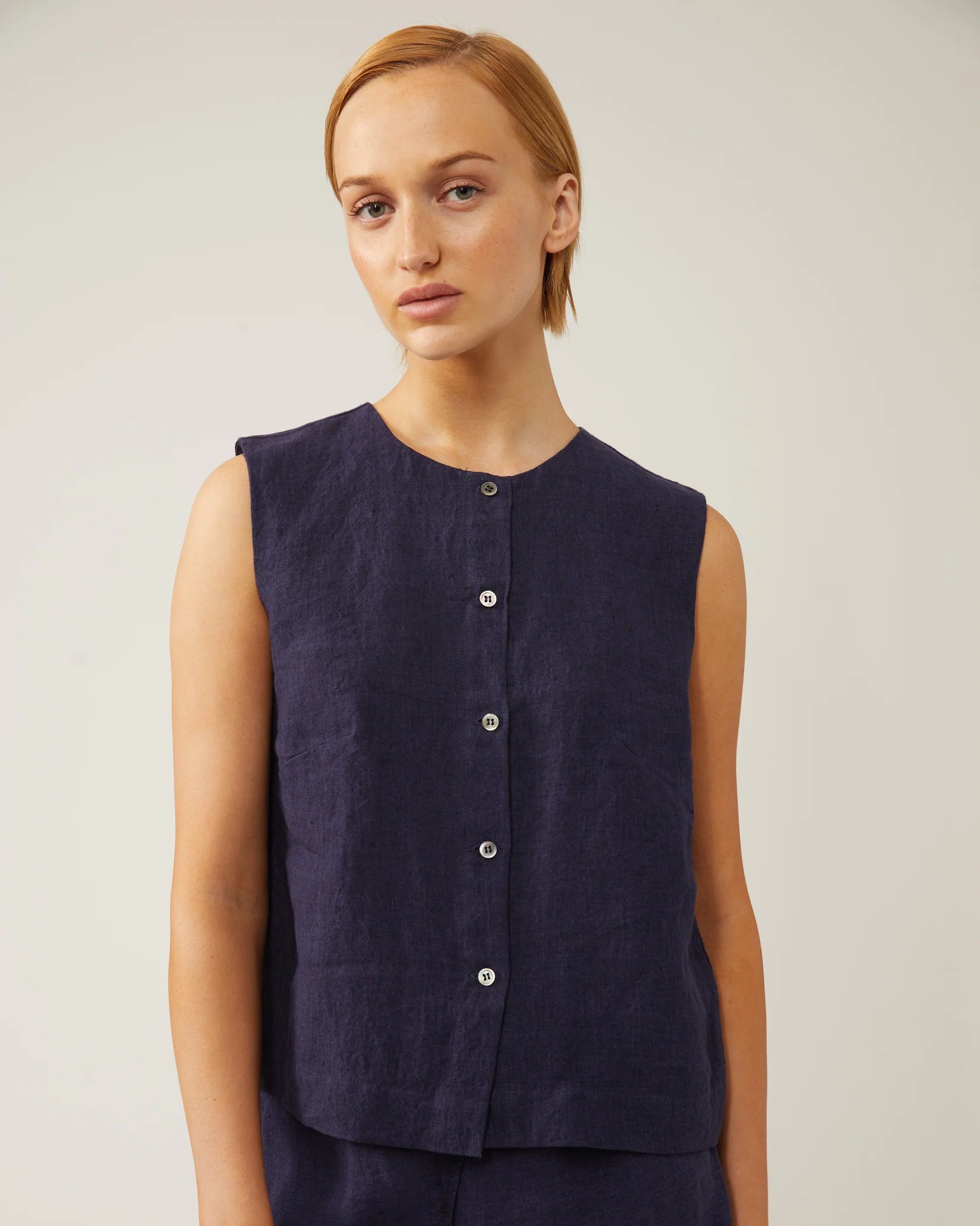 Relaxed fit 100% Linen Vest with a button front. Dress this up or down. Perfect for the office or daytime