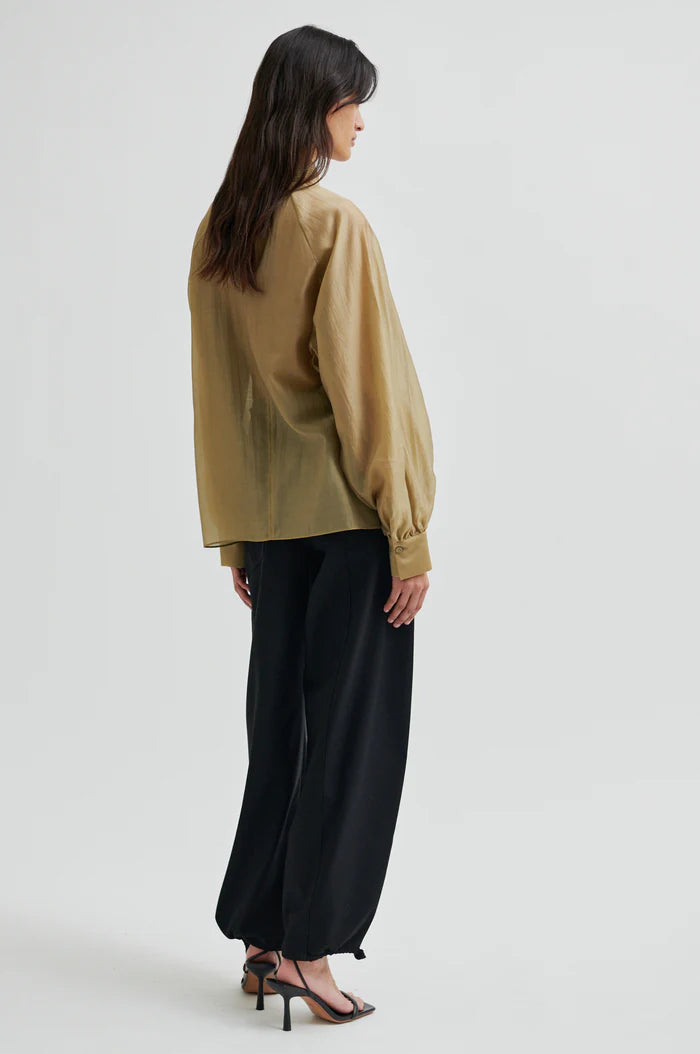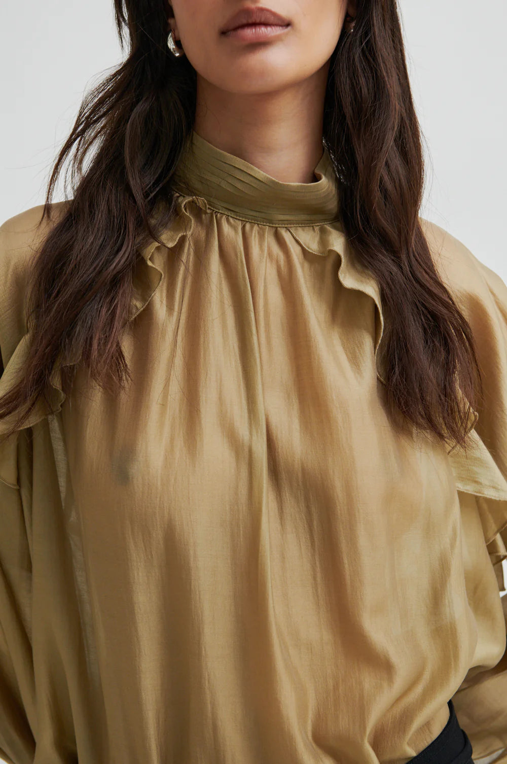 Second Female ruffle blouse. The blouse is made lightweight, semi-sheer fabric. Featuring a stand-up collar and button fastening at back of the neck. Diagonal ruffles across chest. Raglan sleeves with button fastening. Loose, fluid silhouette.