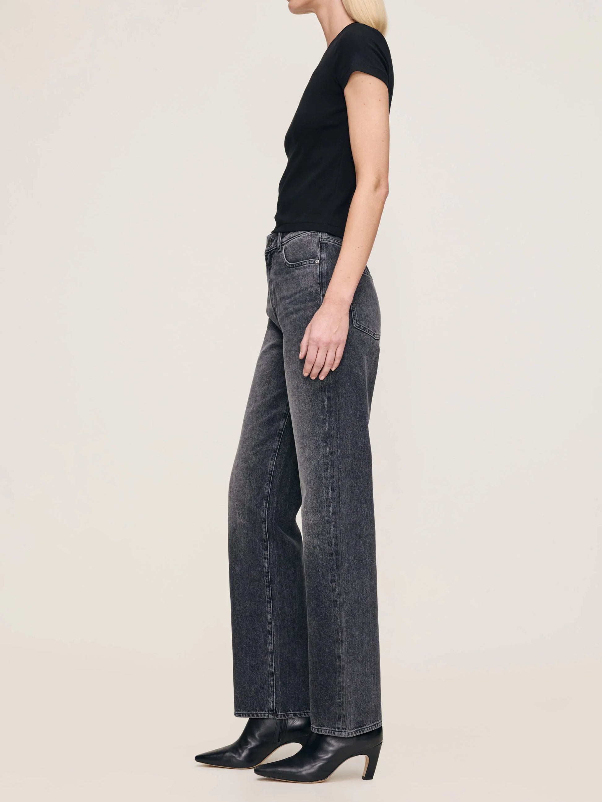 Nightshade is a washed black denim. It features silver hardware, tonal stitching, a clean hem and a black back patch.
