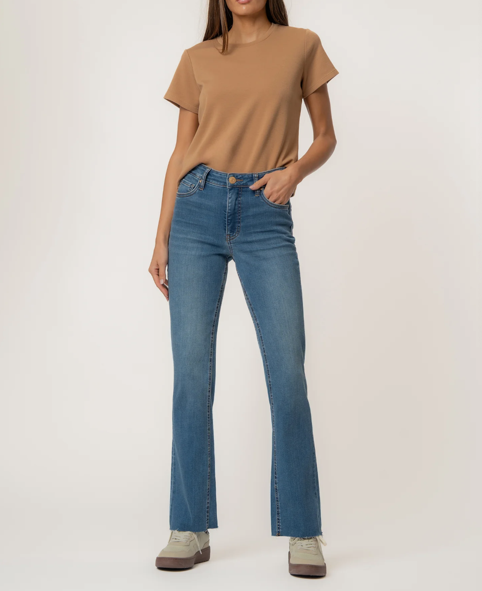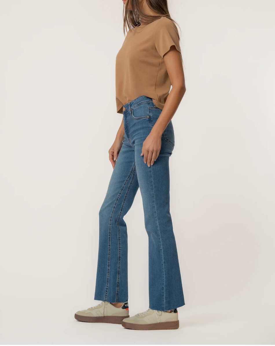 - A fresh take on classic denim. These high rise jeans feature a subtle ankle kick flare and a sleek inset leg detail that elongates the silhouette. Designed in a dark wash with Fab Ab pockets for a smoothing fit, plus stretchy material that moves with you all day.