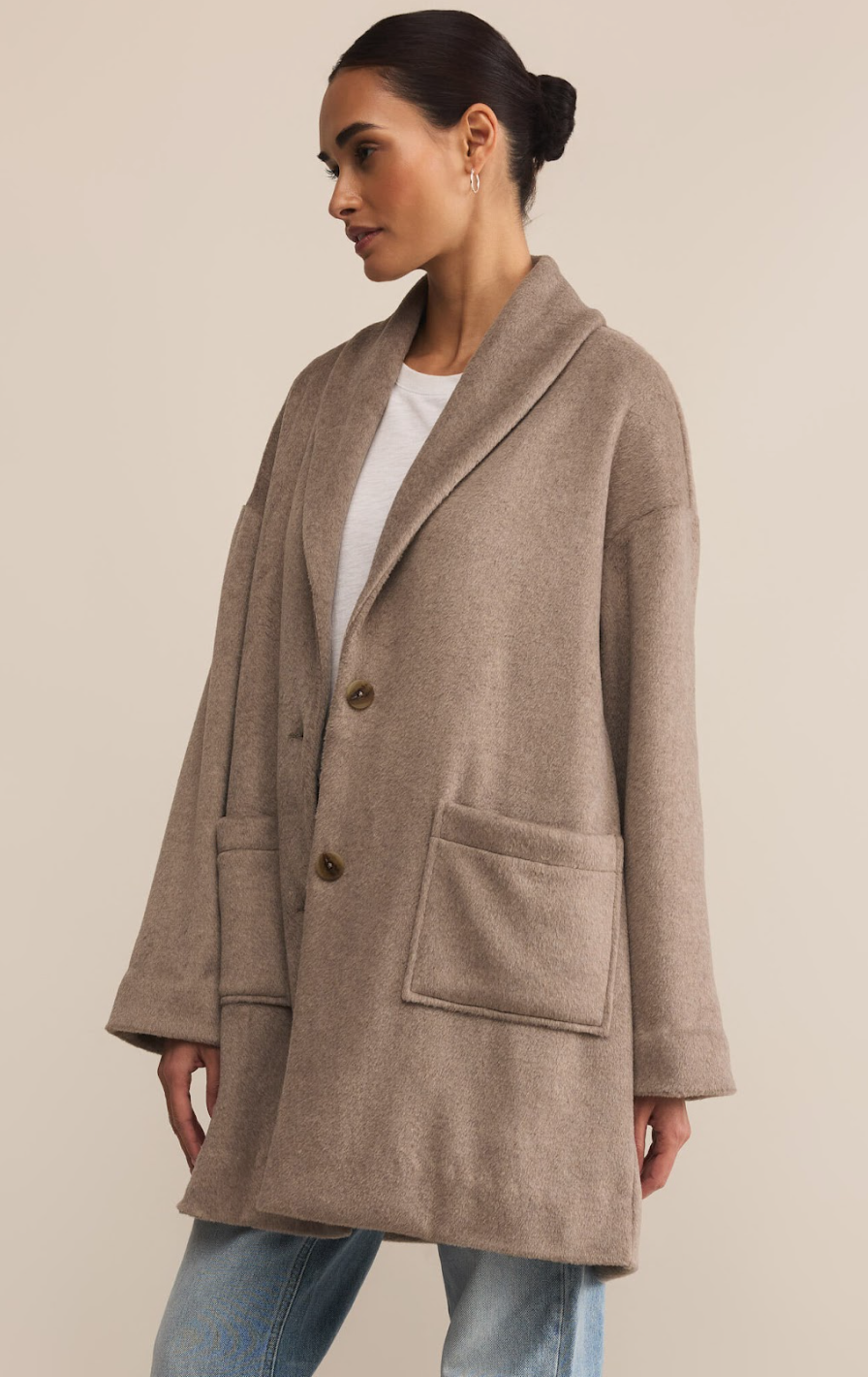 Cozy Peacoat style with a big lapel. Perfect for cozy layering. Relaxed Fit