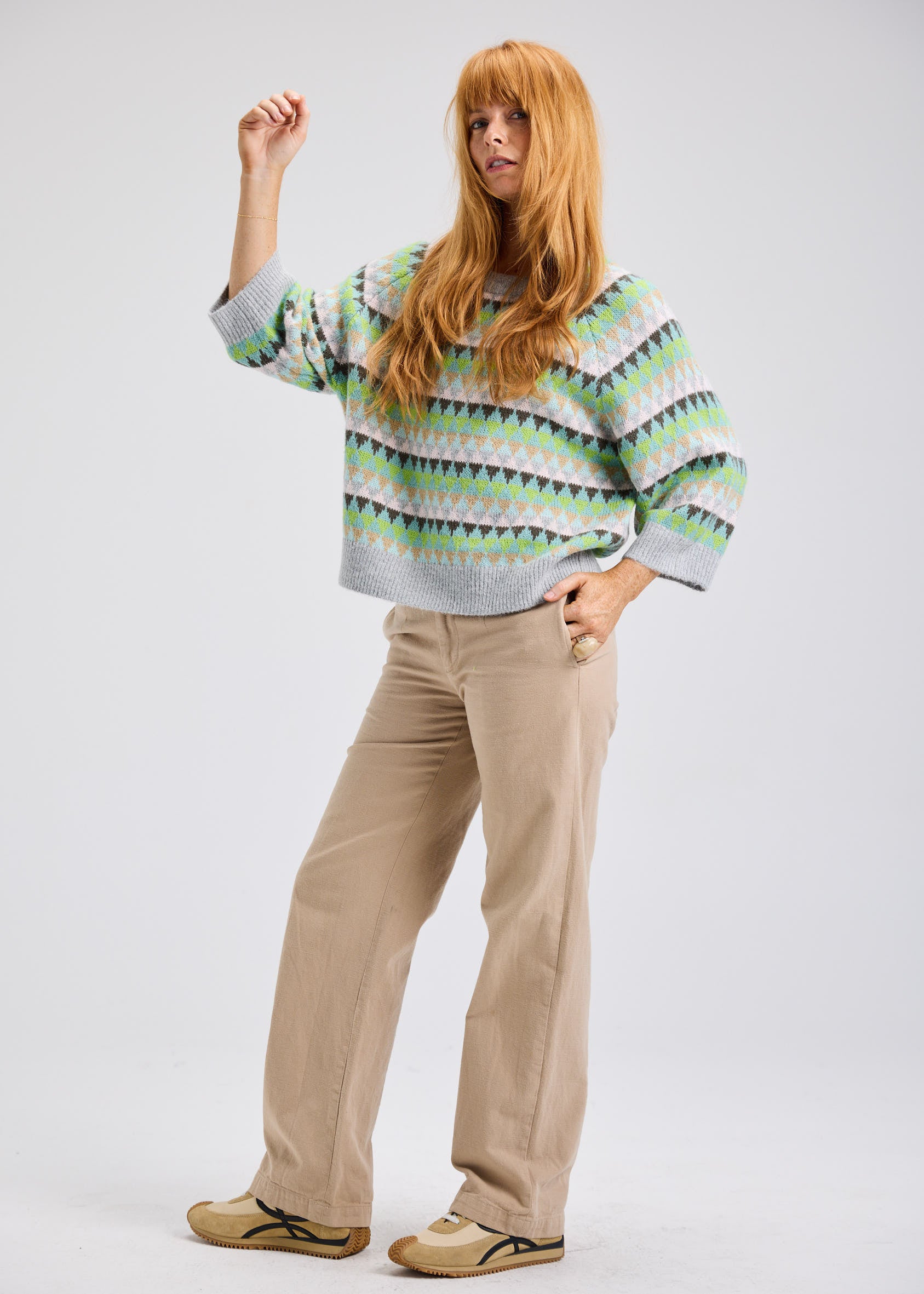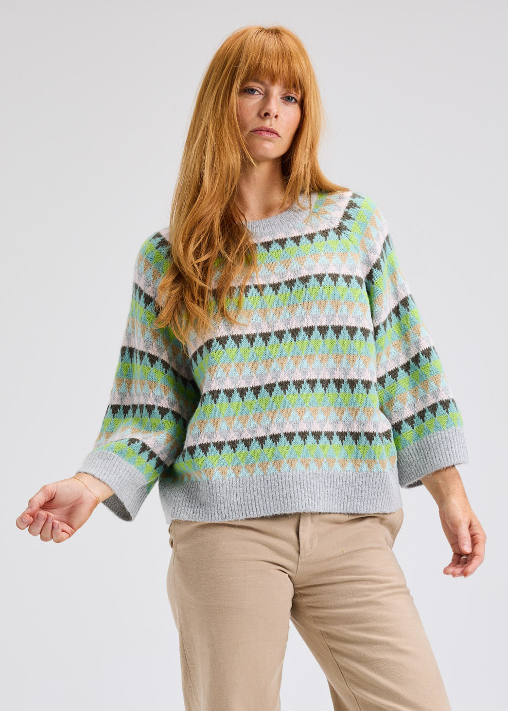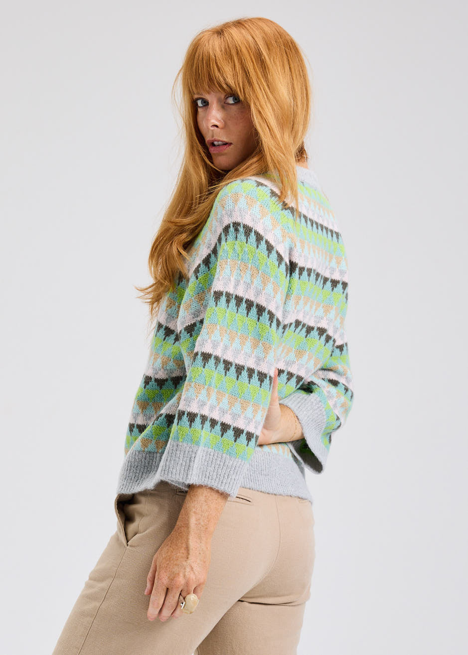 Fairisle pattern in a green colourway. Wool blend. True to size