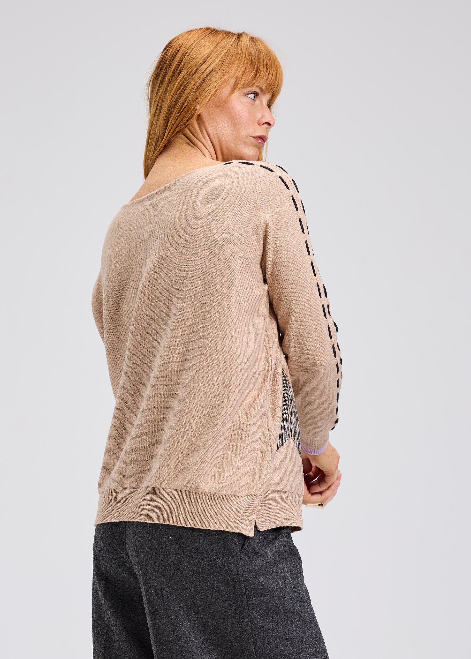 hand embroidery detail, relaxed fit, true to size, cotton cashmere blend