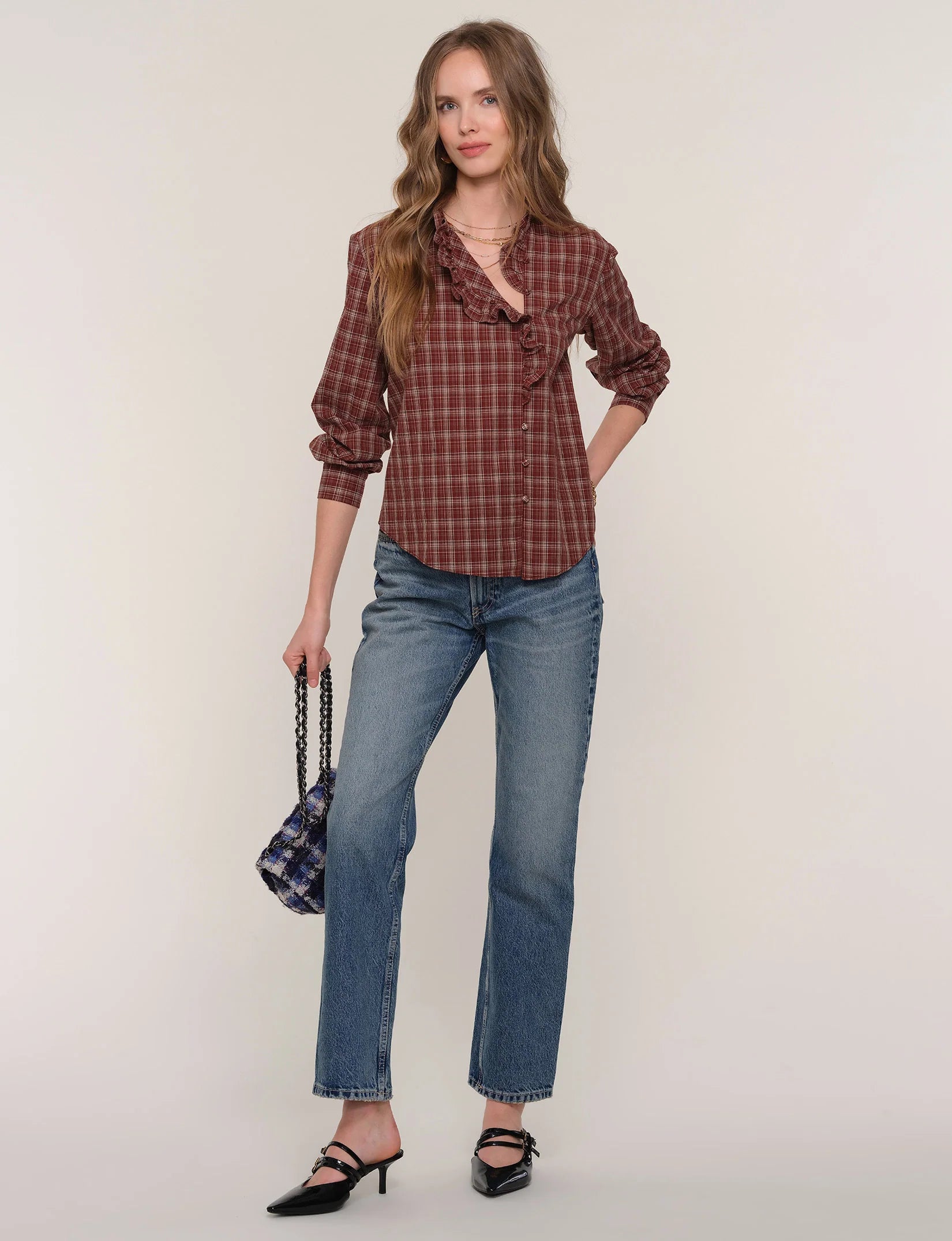 The Taylor Shirt is made from a yarn-dye plaid. A twist on a classic, relaxed fit button down, with a ruffle detail around the neck. It’s light weight and perfect for the transitional season.