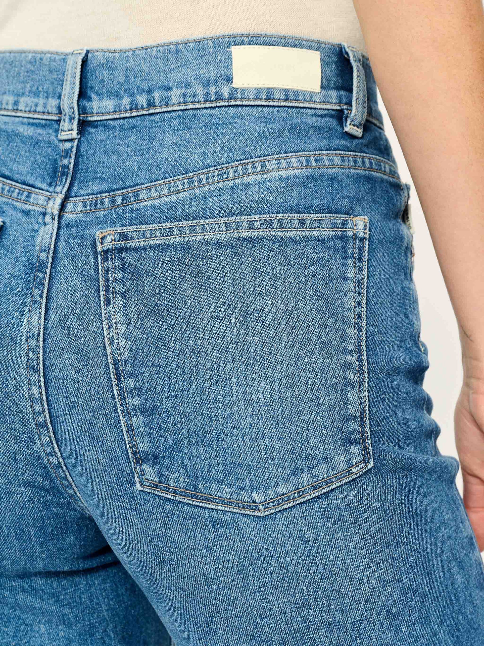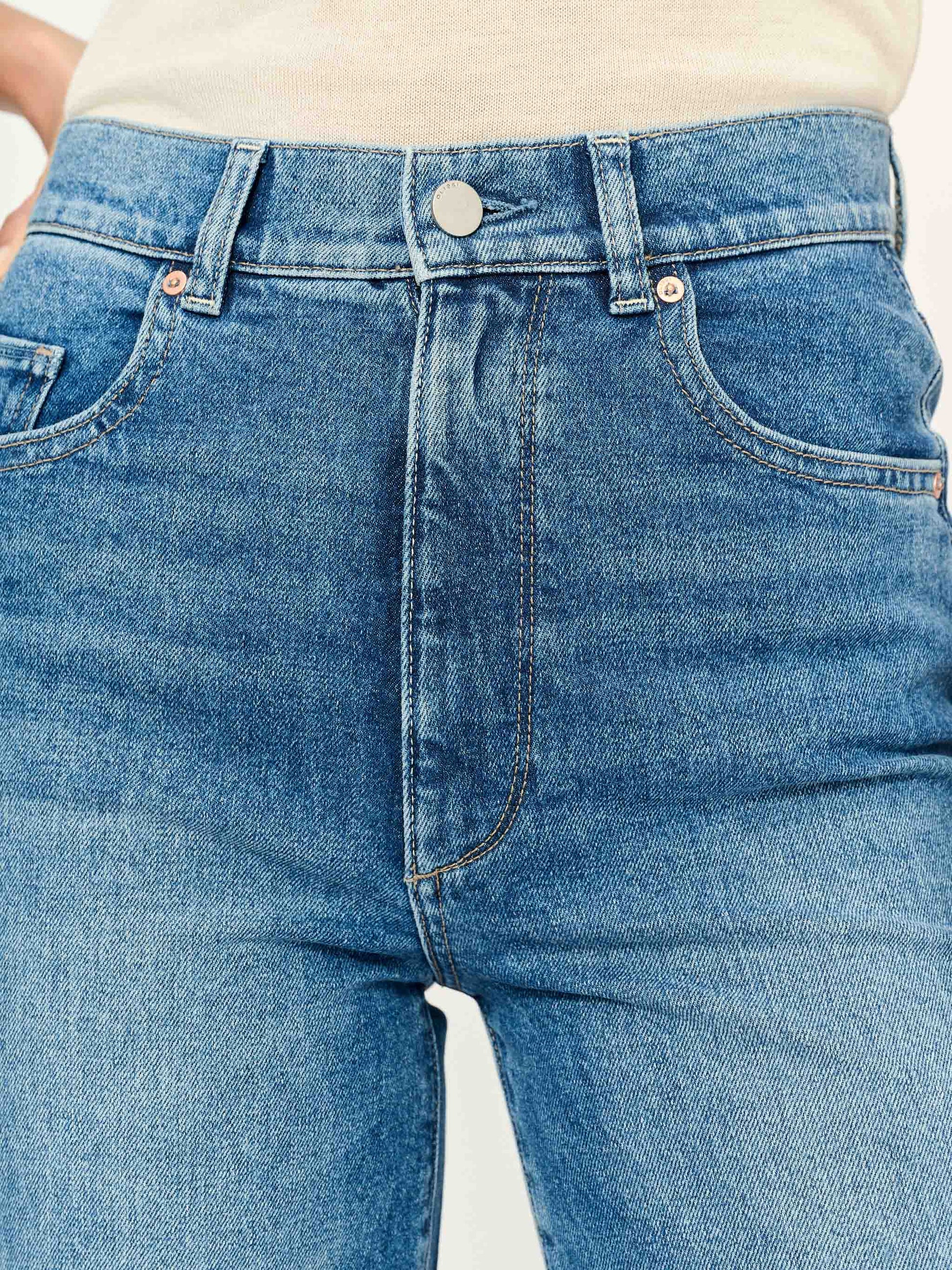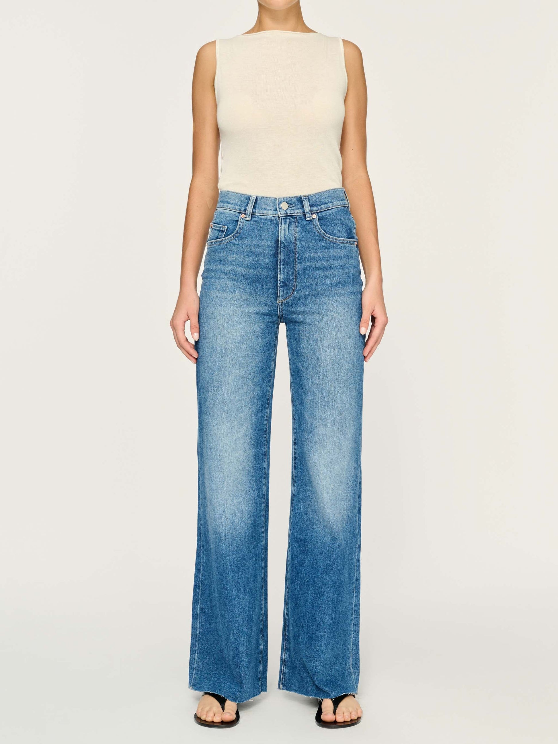 Hepburn is a vintage high-rise that is fitted through the waist and seat, tapering outward from the thigh for a wide leg with a 32' inseam.