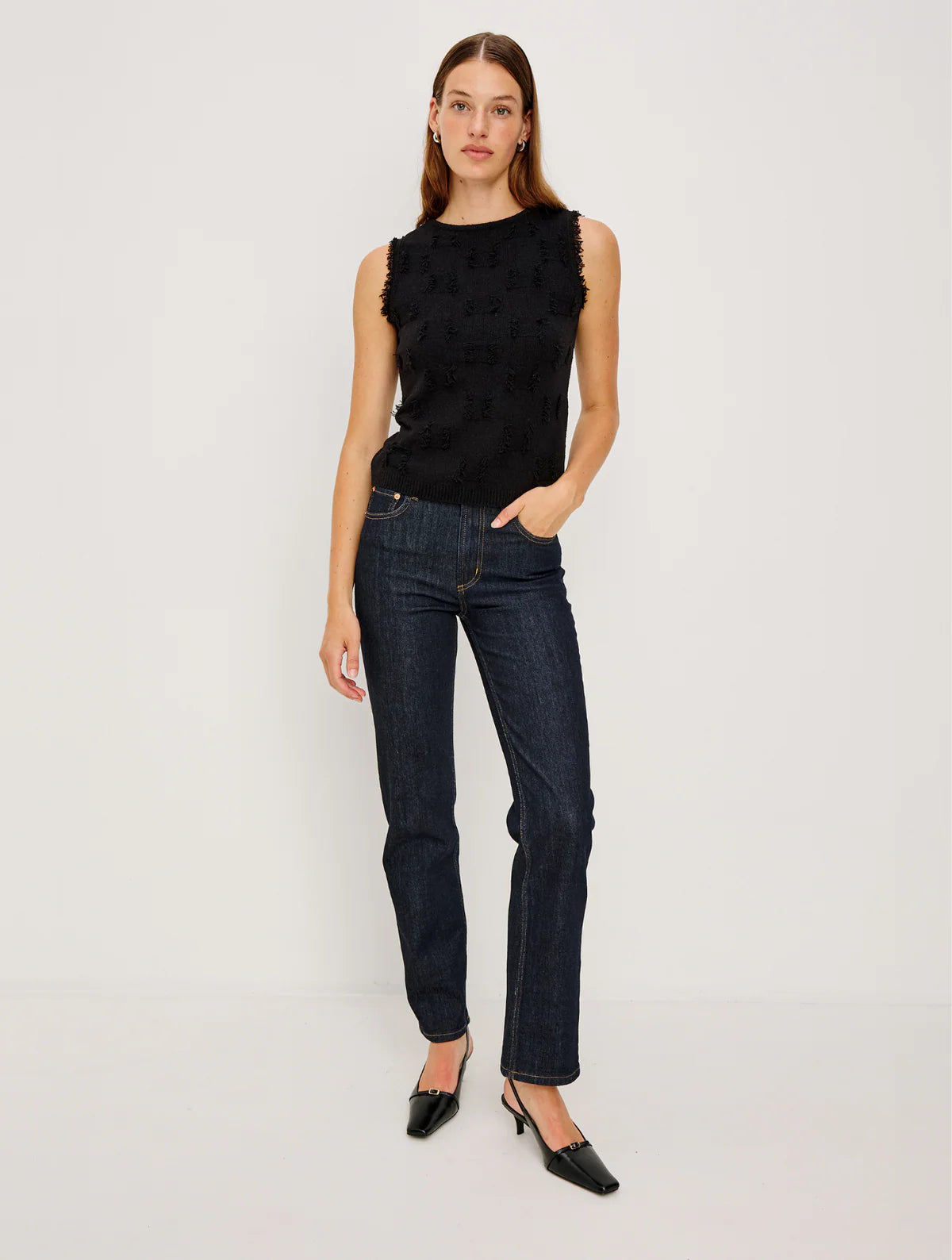 The Vidana is a sleeveless top with a ribbed hem and fine-gauge fringe throughout for a textured finish.