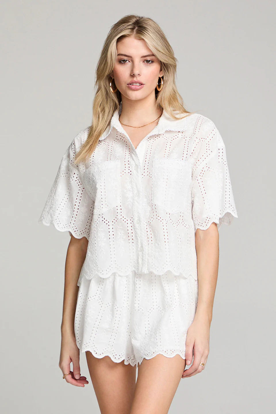 With scalloped hem detailing and patch pockets, Zephyra brings charm to the classic white button down.