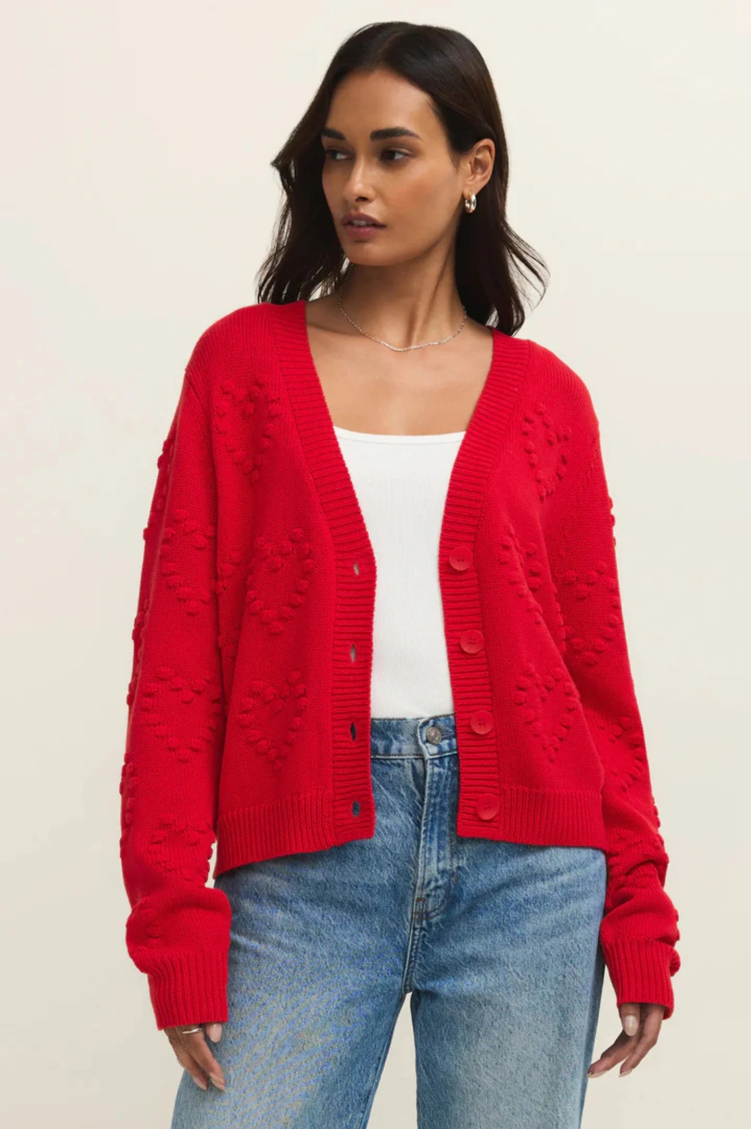 - Made from breathable cotton yarn, this cardigan combines cozy texture with a relaxed fit that’s easy to layer. The dimensional heart-stitch detail adds a charming touch to a timeless silhouette you can dress up or down.