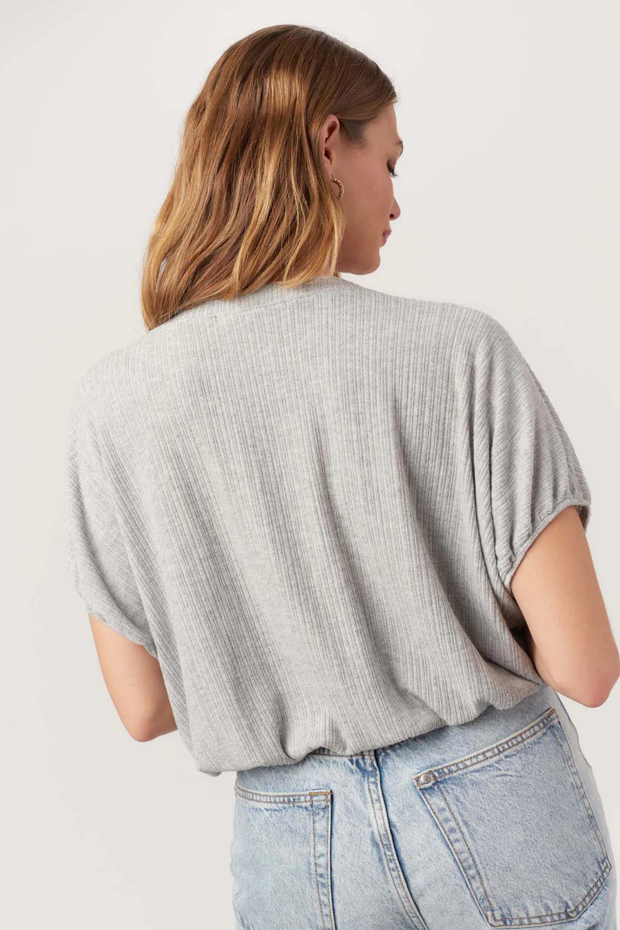 Cerise V-Neck Bubble Rib Tee is made from a soft rib knit with a draped, bubble-style fit. Designed with a relaxed body and a clean V neckline, it’s finished with subtle banded trim that shapes the hemline. An easy, feminine staple that adds a touch of polish to everyday wear.