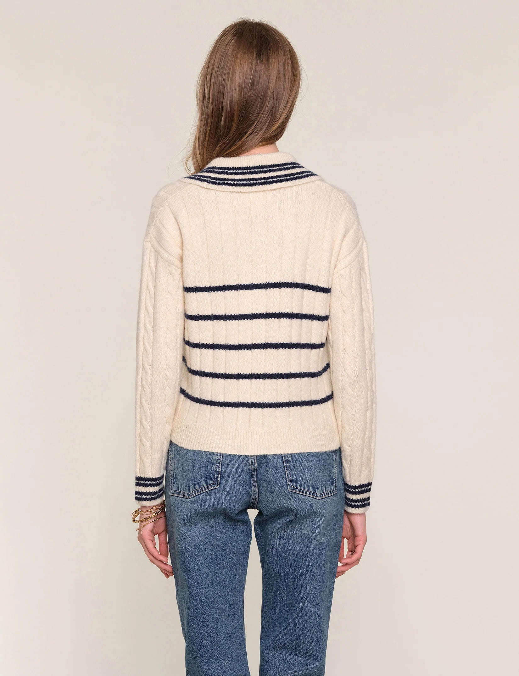 The Cherie Cardi is a shawl neck swaeter with novelty buttons down the front. It features a cable stitch throughout the body and contrast tipping around the edges.
