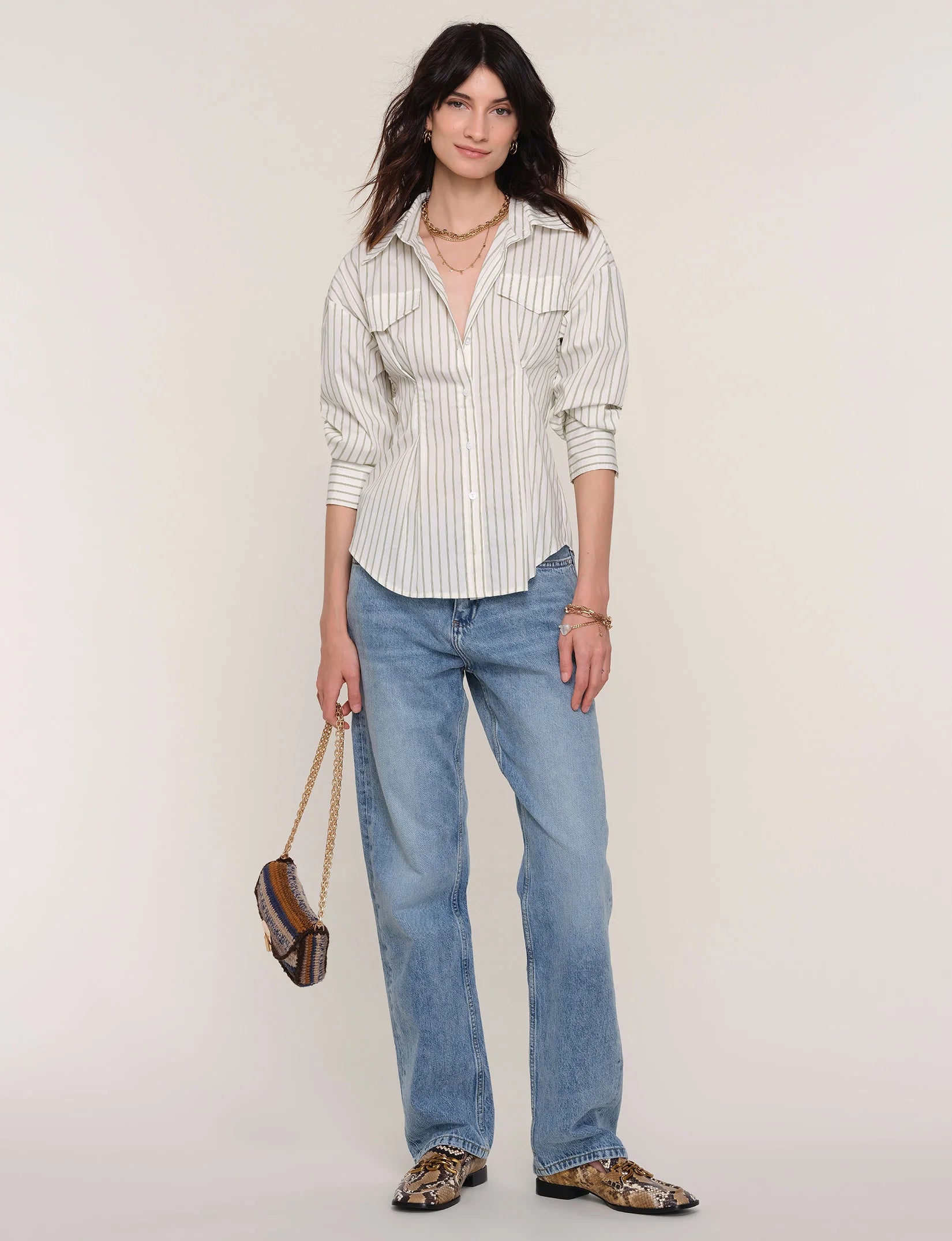 The Darling Shirt is made from a yarn-dye cotton poplin. It has a slim fit, created by inverted pleats at the waist. Wear it with jeans or a mini skirt.