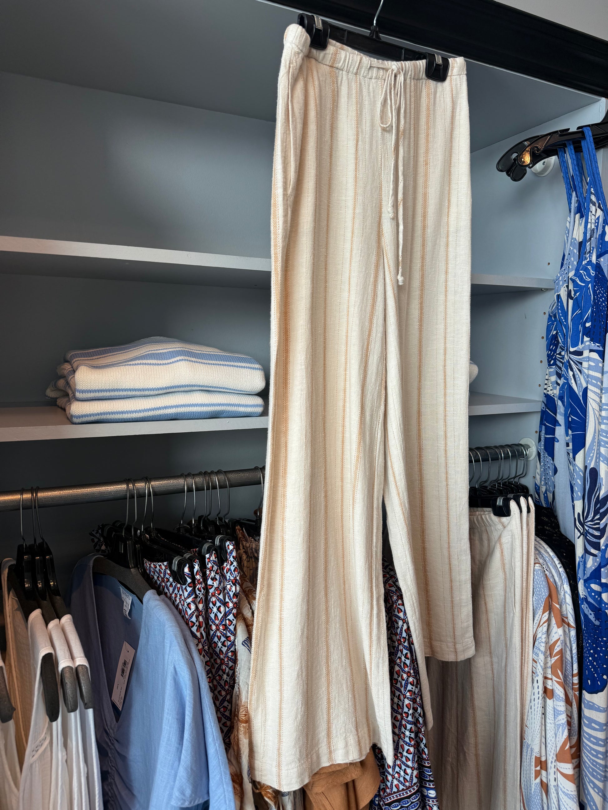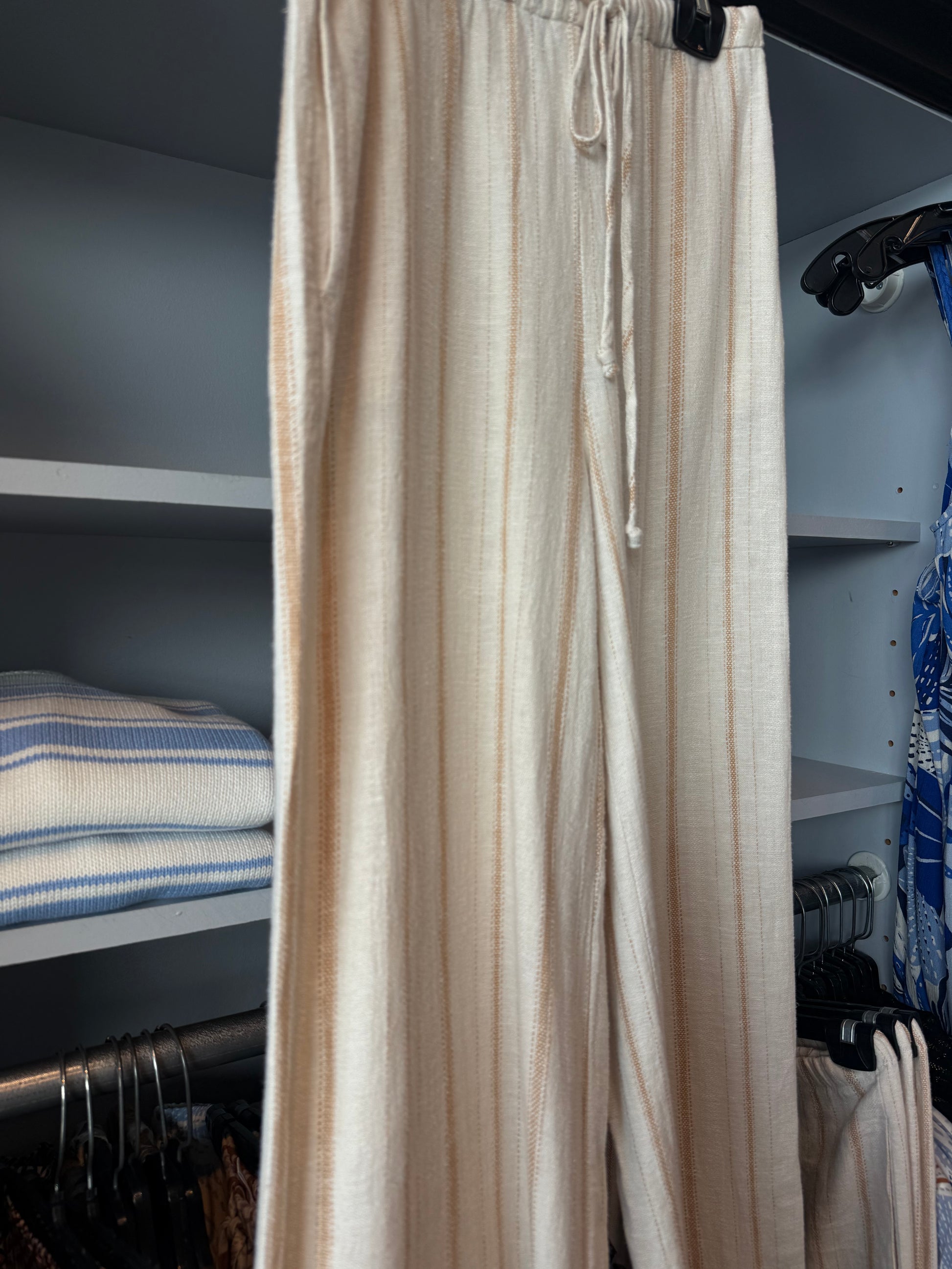 Drawstring wide leg pant in a breathable linen blend fabric. Colour is a natural linen base with a terracotta pinstripe. Pair these back to the Carolina Drawstring top in colour SAND for a matching look. True to size