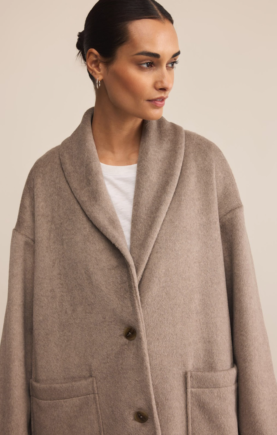 Cozy Peacoat style with a big lapel. Perfect for cozy layering. Relaxed Fit