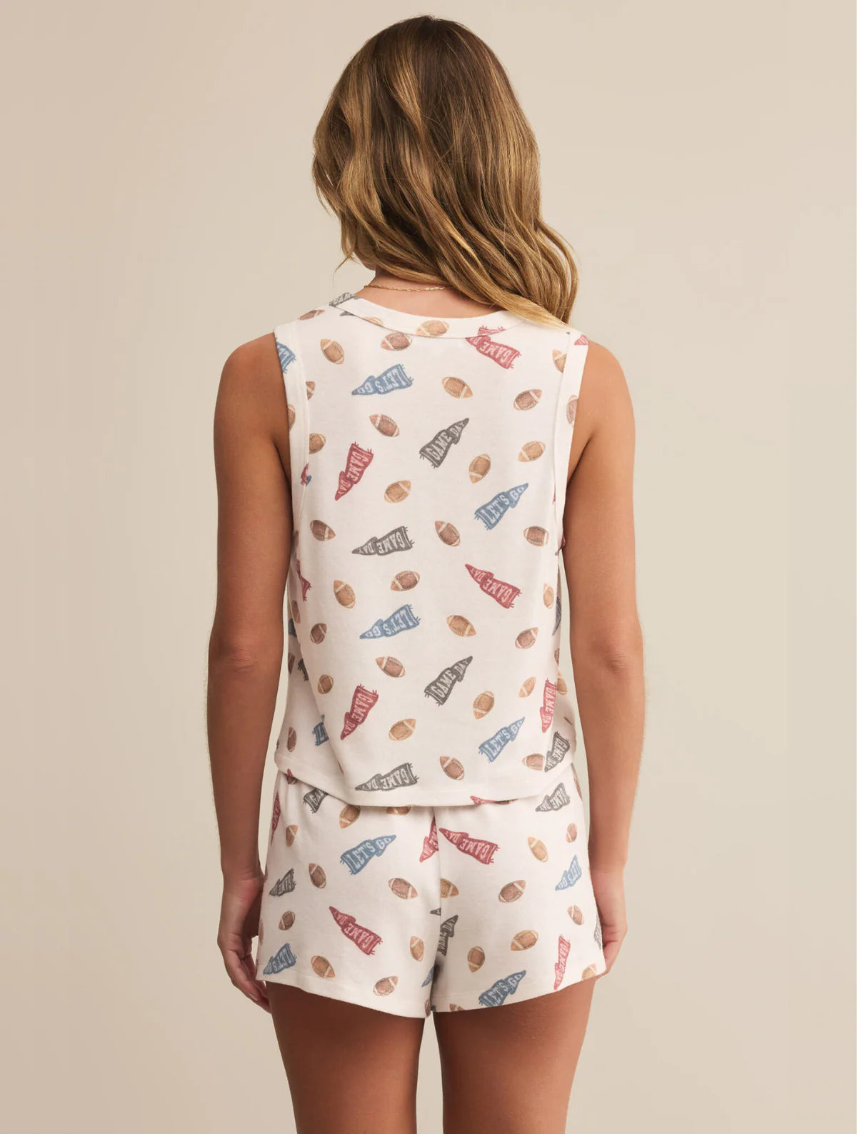 Featuring a playful game day print, this relaxed tank is crafted from cozy brushed fabric with a higher crew neckline and wide straps. Slightly cropped for easy styling, it brings a touch of adventure to everyday looks.