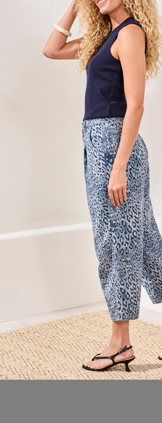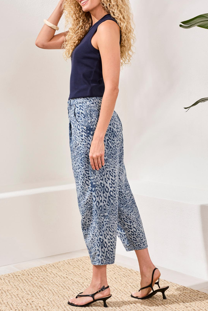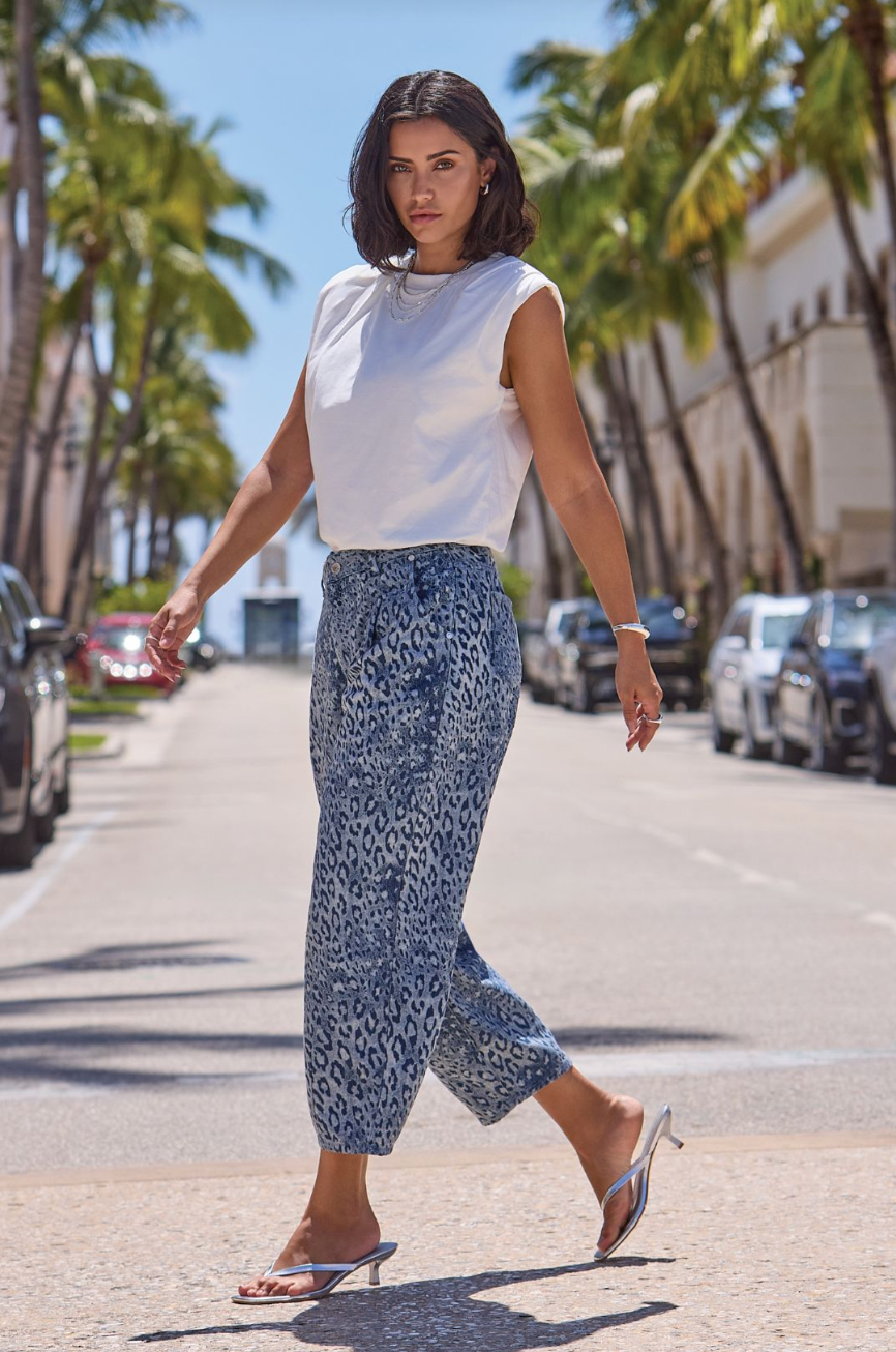 - Barrel style ankle length jeans in a fun monochromatic animal print. wear with a simple basic up top. Dress these up for evening with an oversized blazer and heel.