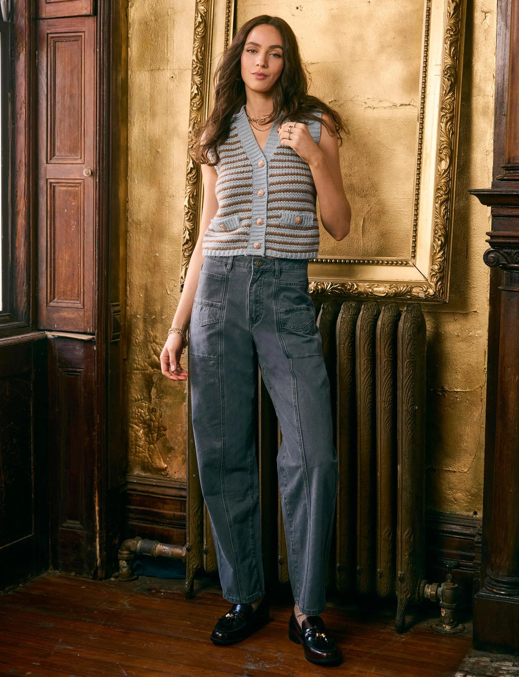 The Asher Vest is a Heartloom favorite for the season. It is made from a striped knit and features a contrast rib trim and novelty buttons. Dress it up with a wide leg trouser, or dress it down with denim.