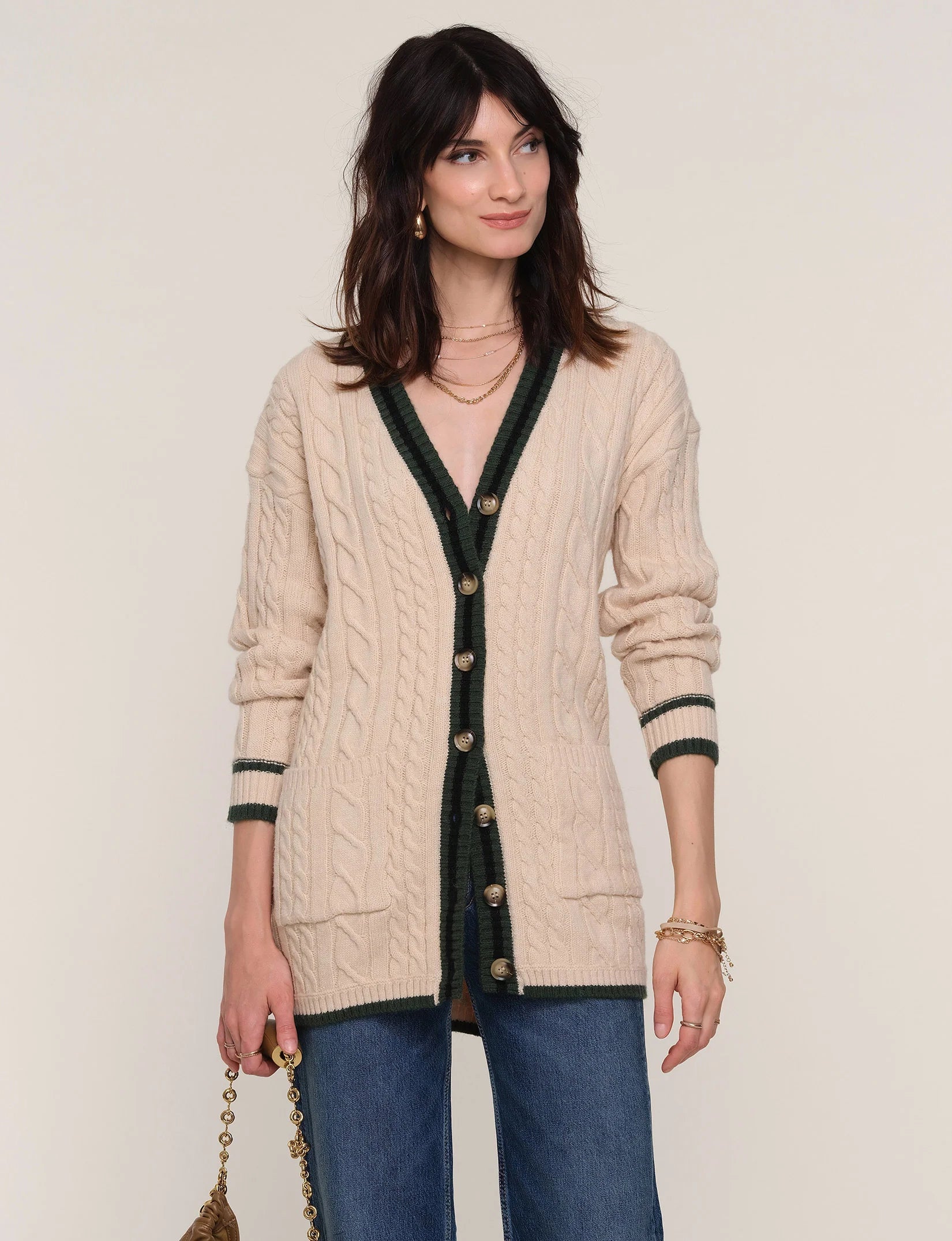 The Basel Cardi is a flattering, long line cardigan. It has a cable stitch throughout the body and contrast tipped edges around the neck, front edge and sleeves cuffs.